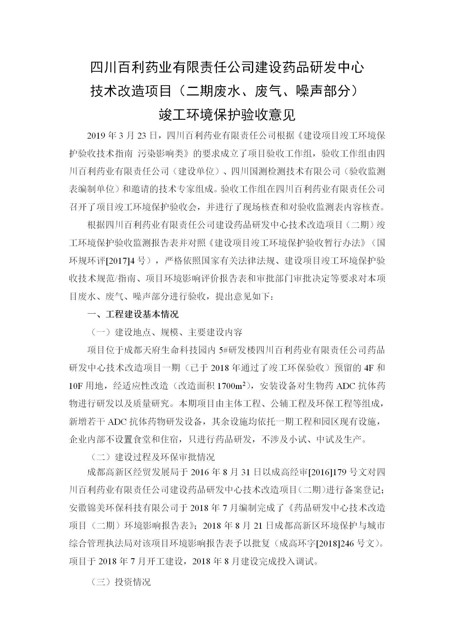 根据《国务院关于建设项目竣工环境保护管理条例的决定》以及环保部《建设项目竣工环境保护验收暂行办法》的公告(国环规环评[2017]4号)现将《四川米兰app体育登录入口·(中国)官方网站有限责任公司药品研发中心技术改造项目(二期)竣工环保验收监测报告》及验收意见公示如下:
